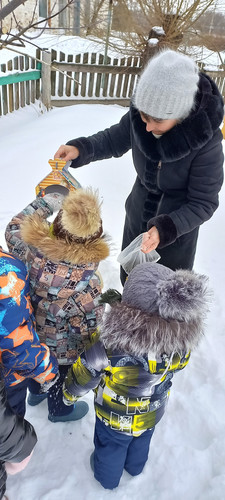 В морозные дни зимы, птицы живущие у нас нуждаются в нашей поддержки. Библиотекарь Ново-Алексеевской сельской библиотеки совместно с воспитанниками детского сада и воспитателем, приняли участи в акции "Покормите птиц зимой". Цель акции: Помочь зимующим птицам нашего региона, пережить холодное время года. Библиотекарь рассказала,какие птицы зимуют у нас постоянно, а какие перелетные. Потом все вместе оставили для птичек угощение - семена подсолнечника и пшено.
