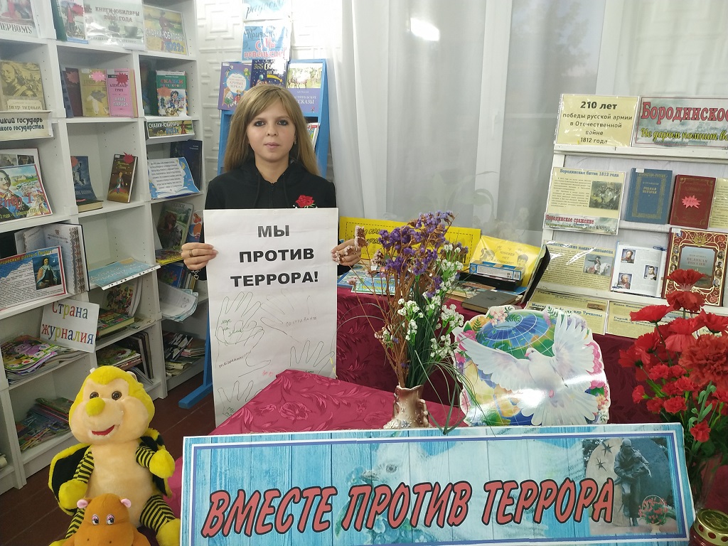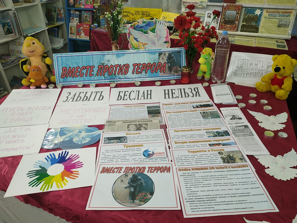 Накануне Дня памяти жертв терроризма, Андреевская сельская библиотека совместно с Сельским Домом культуры провели час памяти, посвященный годовщине трагических событий в г. Беслане , «Три дня в сентябре». В мероприятии приняли участие учащиеся 5-9 классов Андреевской школы. Библиотекарь поздравили всех учащихся с началом учебного года, рассказала трагических событиях, произошедших в первые сентябрьские дни в г.Беслане 18 лет назад. Ребята услышали историю захвата школы по минутам, узнали о правильных действиях спецназа, об освобождении школы, о памятниках, посвященных трагическим событиям. Просмотрели видеофильмы и ролики о тех страшных днях. В конце мероприятия все присутствующие минутой молчания почтили память жертв Бесланской трагедии и зажгли свечи. Библиотекарь провела обзор выставки «Вместе против террора!» и вручила ребятам памятки «Как вести себя при угрозе совершения террористического акта».